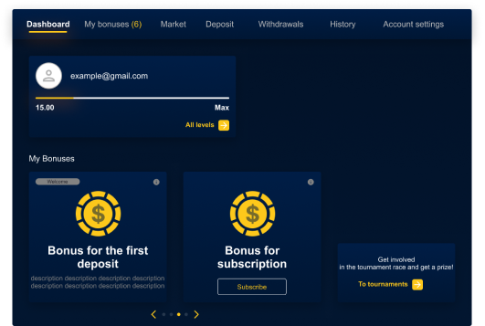 The ability to create an account is an integral part of the transparent interaction with the user of the Safari Casino website. Personal data, an account, a bonus system, the ability to enter a promotional code are a necessity for both parties. The design of the account is easy to understand and intuitive. This is facilitated by the arrangement of windows, different ways of visualizing information (numbers, scales) and colored accent details.